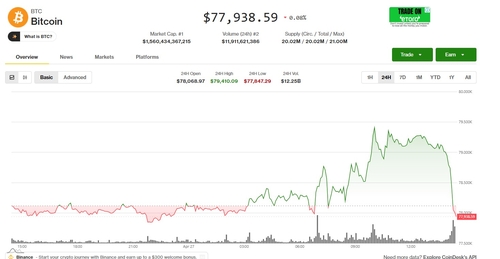 비트코인은 오후 2시28분 현재 전장 대비 0.11% 하락한 77,916.15 달러에 거래됐다.